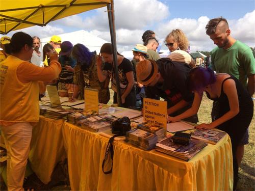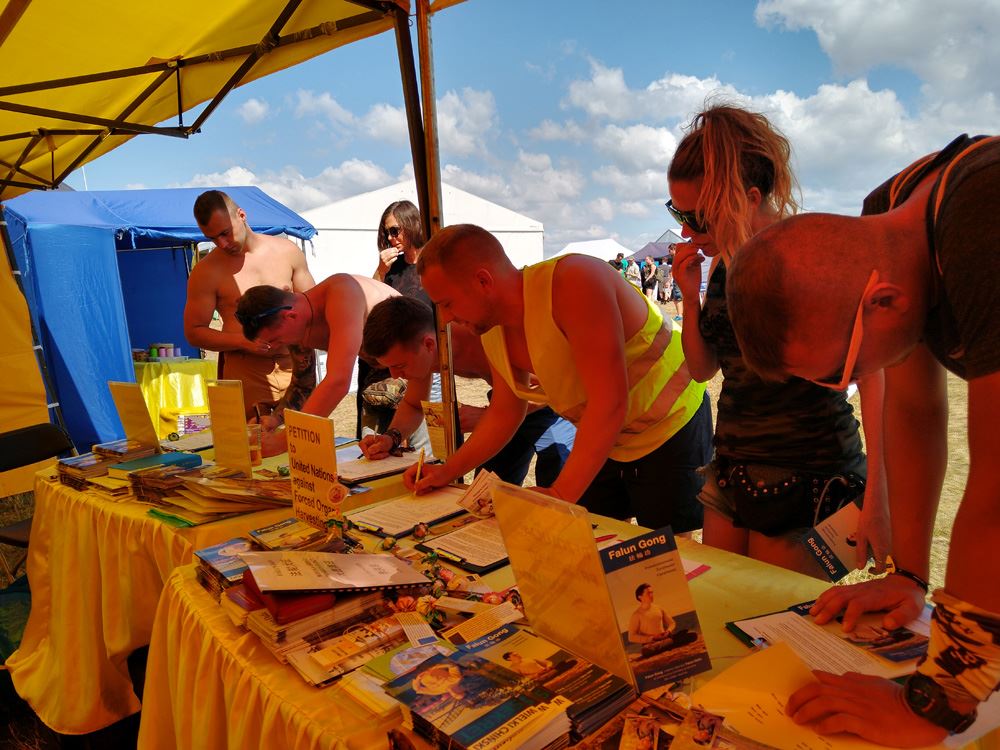 在音乐节正式开幕的前三天,就有几位法轮功学员到现场发放传单,正式开幕的前一天,多位年轻人早早就等在帐篷前准备学炼法轮功,不断有人站在介绍法轮功的条幅前拍照,也不断有人询问法轮功教功时间。