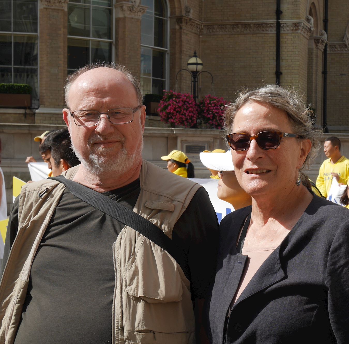 伊冯娜(Yvonne)和安迪(Andy)坐在石头台阶上观看游行队伍。安迪看着刚刚走过去的“法轮大法好”方阵说:“游行队伍看起来很愉悦(cheerful),法轮功学员很友善,人们喜欢在这里驻足,这是很美好的一天,很美好的一群人。”伊冯娜说:“我们来自伦敦北部,听说过法轮大法,知道这是来自中国的被打压的一种精神修炼,他们被中共打压,生活得很艰难。我觉得这(功法)很美。”在得知中共活摘器官真相后,她表示:“这个事情令人感到非常悲哀。”她很认同法轮功学员这种和平的向人们讲述真相的方式。