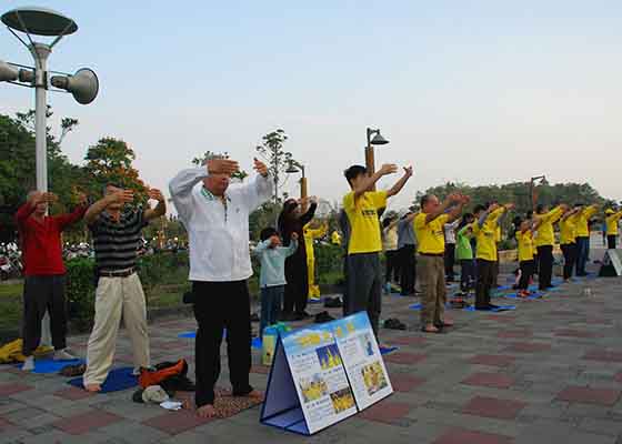 台湾嘉义法轮功学员每个星期六在嘉义市文化公园、香湖公园、运动公园及近郊的仁义潭风景区集体炼功,向游客介绍功法,并揭露中共迫害。