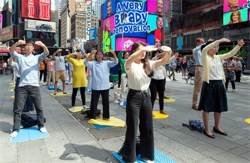 ![]() 图1-4:法轮功学员在纽约曼哈顿42街时代广场(Times Squares)集体展示功法。 |