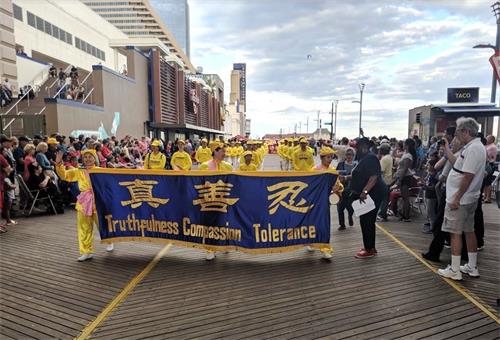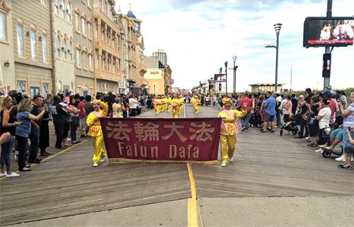 【明慧网二零一九年九月十四日】二零一九年九月七日,第一届“庆祝美国游行”(Celebrate America Parade)日在新泽西州大西洋城著名的景点——“海滨木板大道”(Board walk)上举行,花车和乐队纷纷亮相,法轮功队伍应邀共襄盛举。法轮功功法演示和中国传统的腰鼓表演,轰动全场。当地居民和游客见到非常惊喜和激动,有的高喊“法轮大法”,有的欢呼“我爱你们”,有的跟在队伍后面一路学功,气氛热烈。