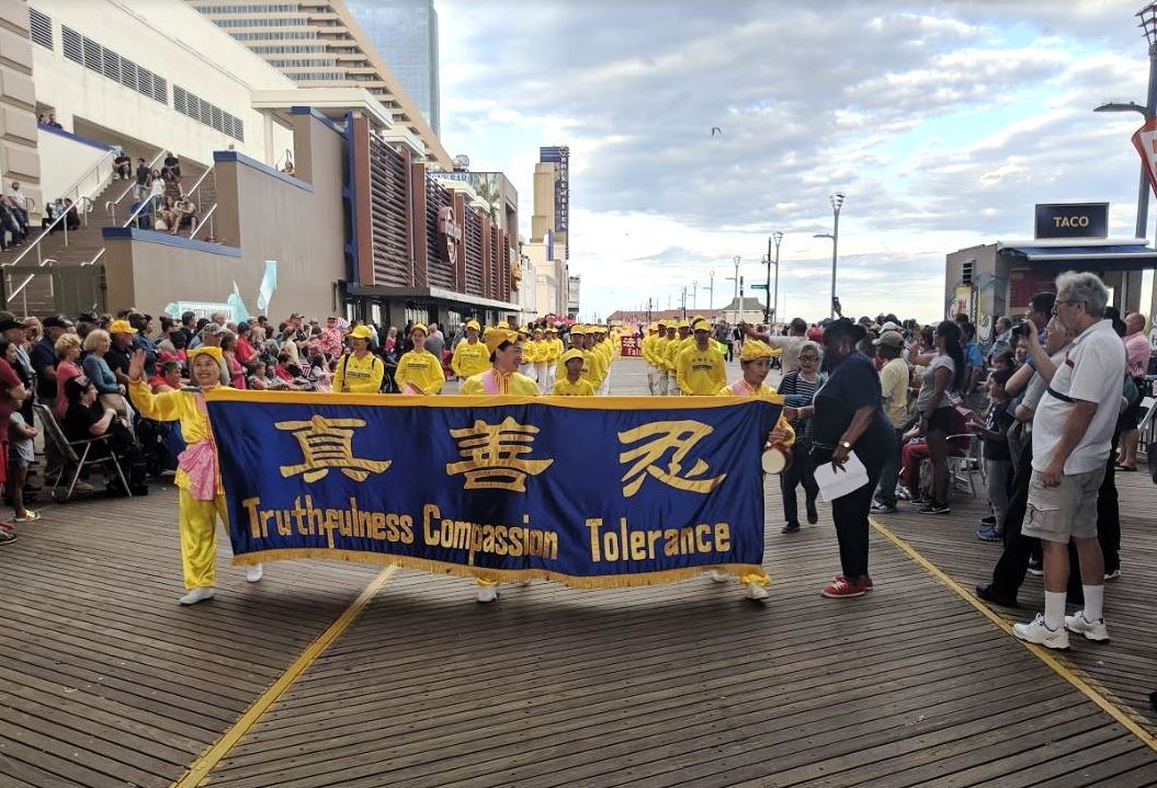 大西洋城警察汽车引领头阵,花车、彩旗、军乐队、哥伦比亚小姐、大西洋城警察荣誉守卫队、海军护卫队、前大联盟棒球队、前职业足球运动员队、前飞行员队、911纪念旗帜方阵、州立大学、斯坦顿大学、新泽西州警察……近百个游行队伍服装明艳,浩浩荡荡。法轮功队伍第四十九个出场。