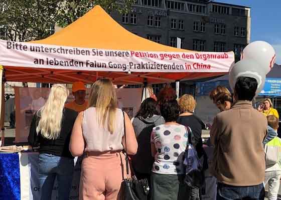 9月14日德国科隆大教堂侧面的广场上正在举行“中国节”的庆祝活动。面对大量对中国感兴趣的游客,学员们展示了法轮功的五套功法。