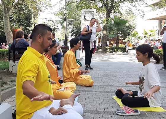 八月三十一日星期六,法轮功学员在土耳其伊斯坦布尔最体面的街区之一的尼桑塔希举办讲真相活动。不少人看到法轮功的美好,前来学炼功法。