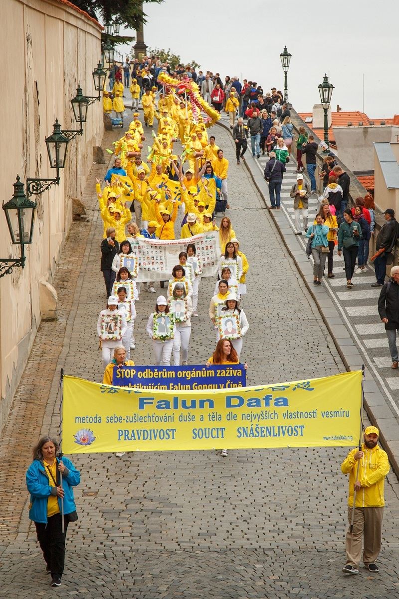 游行队伍沿途经过繁华的闹市区小城广场、查理大桥到达老城广场。法轮功学员在老城广场举行集会,用英文、捷克文和中文向布拉格民众和游人讲真相,揭露中共迫害法轮功、特别是活体摘取法轮功学员器官的罪行。