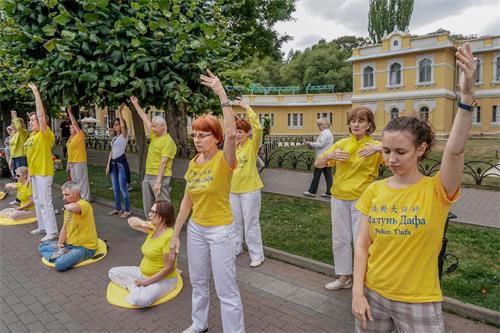 图1~4:在俄罗斯度假小城基斯洛沃茨克市(Kislovodsk)的度假村大道旁,法轮功学员们在展示五套功法 |