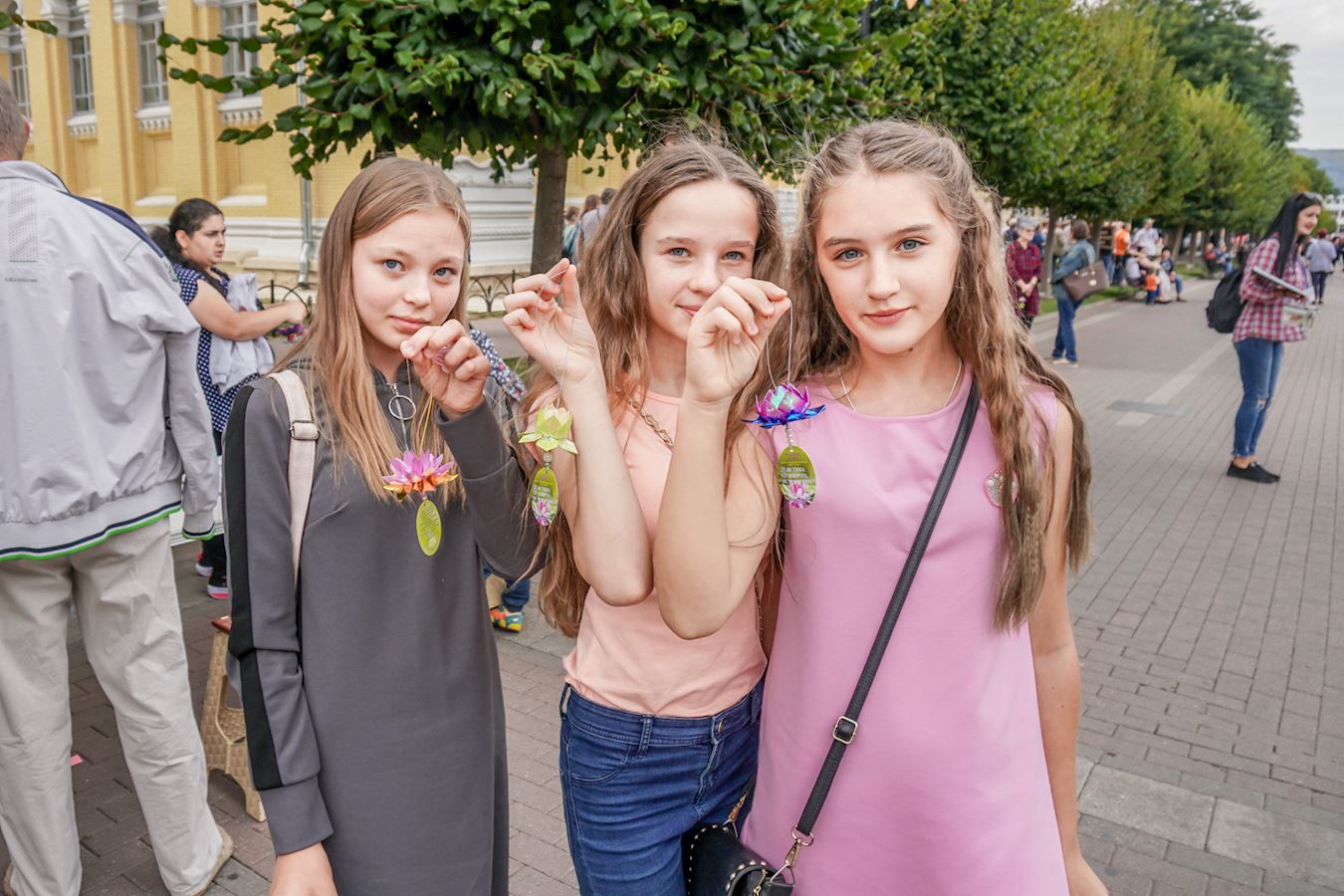 图8:从左至右:基斯洛沃茨克市年轻人柏丽娜(Polina)索菲亚(Sofia)和 维诺尼雅( Veronika) 手举和法轮功学员一起折叠的纸莲花 |