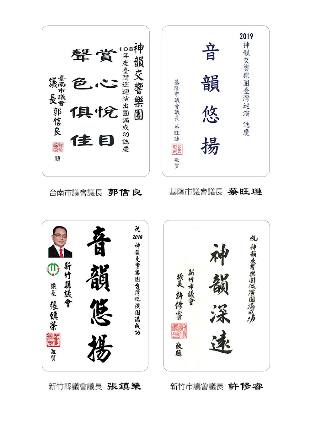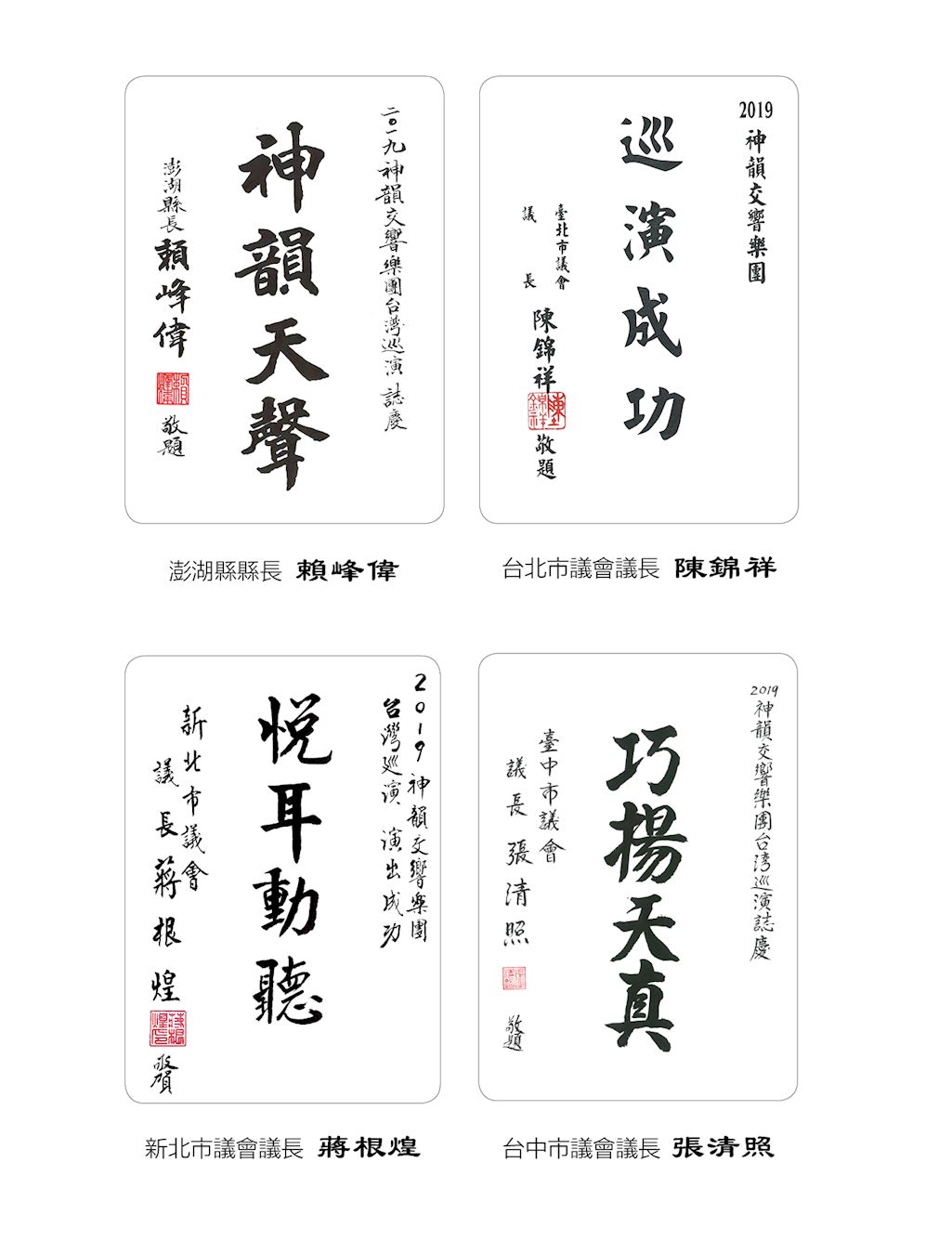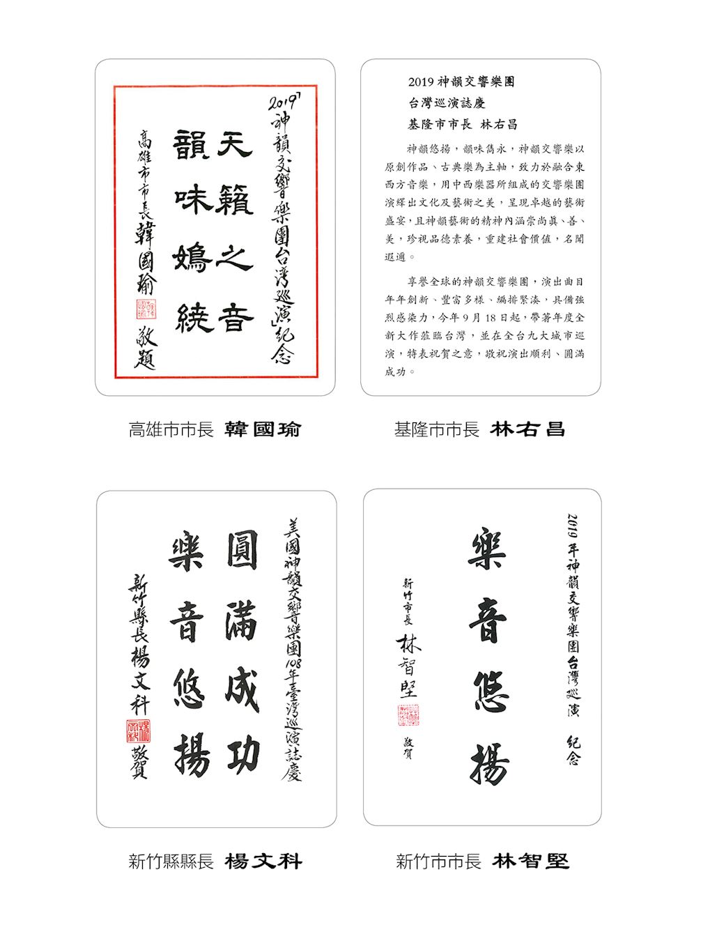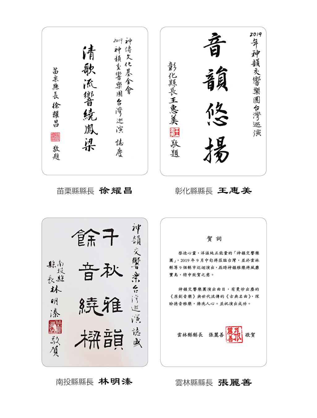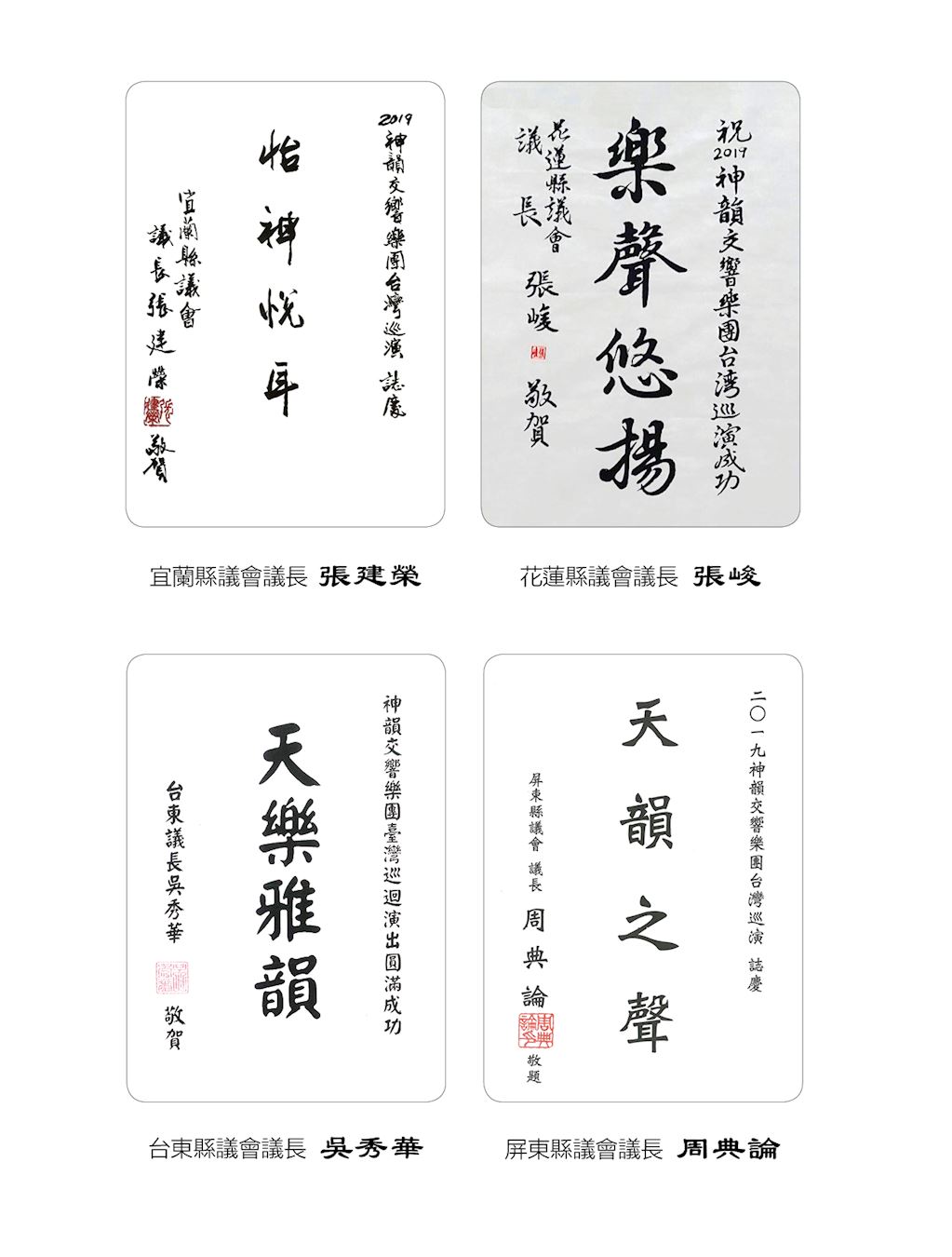 苗栗县长徐耀昌赞扬神韵交响乐团“清歌流响绕凤梁”、彰化县长王惠美称赞“音韵悠扬”、南投县长林明溱推崇神韵交响乐“千秋雅韵 余音绕梁”,云林县长张丽善则赞赏“启迪心灵 洋溢纯正能量”。