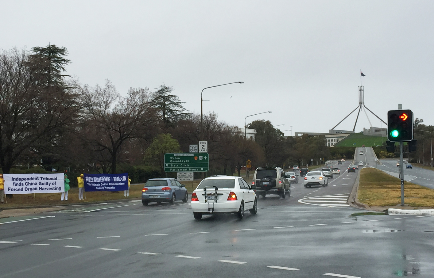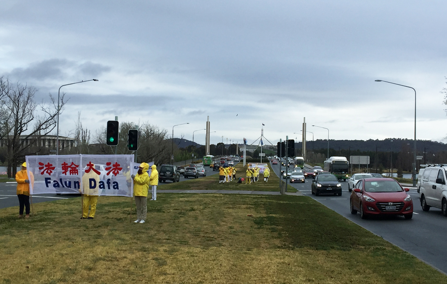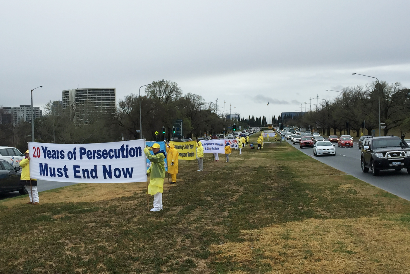 九月十七日凌晨,在经历了前一天日间二十五摄氏度、南半球春天较罕见的高温后,一夜雨雪交加,首都被皑皑白雪覆盖,甚至导致高速公路的交通严重受阻,气温骤降至摄氏零度以下。各地法轮功学员冒着风雨从清晨七点开始,在通往国会山庄的主干道和主要路口,拉起中英文横幅表达诉求。当天过往车辆不时鸣笛,支持法轮功学员展示真相,倾佩法轮功学员无畏的精神和勇气。