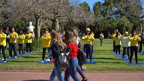 十六日,阿根廷法会的第二天,法轮功学员继续去中共驻阿根廷使馆讲真相。学员演示功法的时候,一名二十多岁的中国年轻小姐在跟着模仿学员的动作。她告诉学员,自己很小的时候在中国电视上看到污蔑法轮功的宣传,但来到阿根廷后就再不知道什么了。她仔细阅读了真相展板。学员邀请她去炼功点。她表示感谢,并说:我会去的。