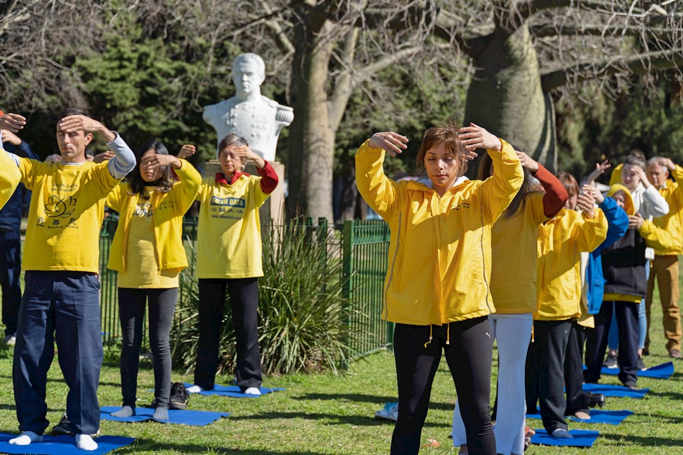 学员在演示功法时,一名七~八岁的小男孩牵着父亲的手还未走近便叫道:是中国人,中国人!其实他看到的学员没有中国面孔,可是他坚持说:中国人,中国人。一名学员递给他们真相传单。小男孩一边走一边大声念:Falun Dafa es bueno!( 法轮大法好!)