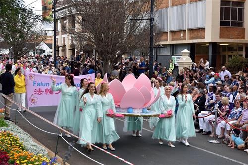 今年花卉游行的主题是“花的力量”,法轮功团体的游行队伍由三部份组成,分别是“舞龙队”,“莲花仙子队”,“腰鼓队”。主办方在游行沿途设置多处高音喇叭和主持人讲解,当一位主持人看到一朵手工制作的粉色大莲花花轿,四周围绕着身着古典仙女服的法轮功学员时,发自内心的赞叹:“好漂亮的花啊!真是太喜欢了!”紧接着另一位主持人给在场所有观众介绍:“法轮功从一九九九年开始每年都加入我们的花车大游行,法轮功是以真善忍为指导原则的一种传统修炼功法,有五套动作作为其辅助修炼,全世界有超过一亿的人因为修炼法轮功身心受益。”
