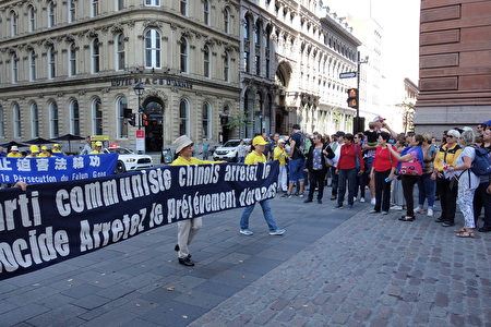 集会之后法轮功学员举行了游行,由蓝色的天国乐团打头阵,其后是横幅队伍。队伍从唐人街出发,途经知名旅游景点老港、市中心的圣劳伦大街和河内李维斯克大街,沿途受到民众热情关注。