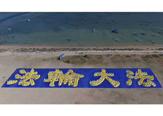 九月二十日,即印度尼西亚法轮大法修炼心得交流会的前夕,在登巴刹沙努尔海滩上,法轮功学员们举行了一场排字活动。