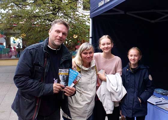 九月二十一日,芬兰法轮功学员跟往常一样,在甘比市中心搭起真相帐篷,向民众介绍法轮功,并讲述中共迫害法轮功和活摘器官的罪行。