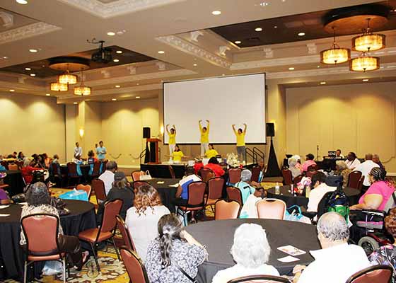 休士顿法轮功学员在海湾地区活动中心年长者健康展览会上展示功法,观众被法轮功的功法所吸引。