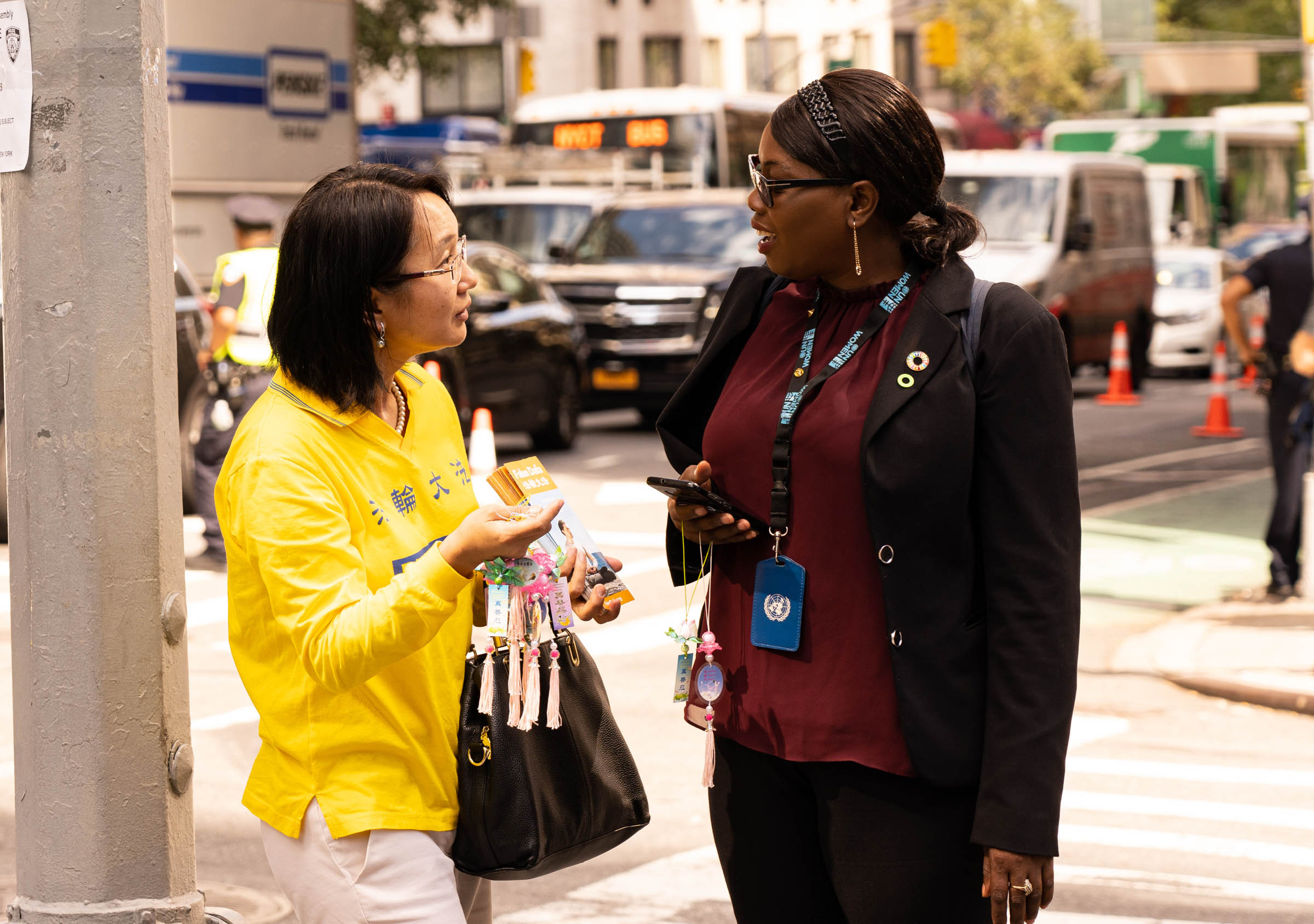 联合国前,第二大道上,忙碌的人流川息不停,从早上七点到晚上七点,随处都能看到法轮功学员的身影,黄色的法轮功T恤衫非常显眼。他(她)在广场上,有的静静地打坐炼功;有的举着真相横幅静静地站在第二大道上;有的手中拿着真相传单,迎向走过来的每一个人,诚心诚意的告诉他们:“法轮大法好”。
