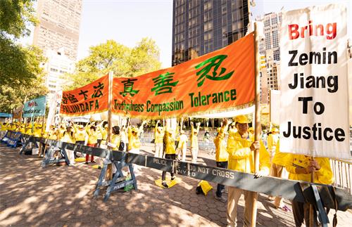 峰会期间, 每天早上七点左右法轮功学员就来到哈马绍广场,展开大型中英文横幅“法轮大法好”,“停止迫害法轮功”,“法办江泽民”等。学员们还在峰会人员和车辆的必经之地——联合国前的第二大道上的四十四街到五十二街的多个地段上,展开大型的英文横幅“法轮大法好”、“停止迫害法轮功”、“法办江泽民”、“停止活摘器官”、“共产主义的终极目的是毁灭人类”等。