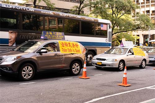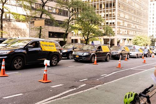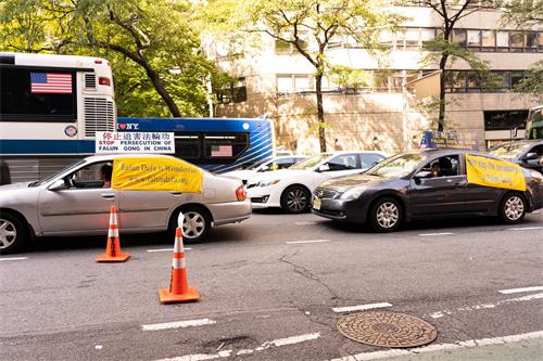 图11~14:这几天的曼哈顿二大道上还有一道特殊的风景:一辆辆的私家车的车顶和车身上都悬挂着“法轮大法好”的横幅,黑灰色的车身,亮眼的横幅,美丽的小莲花,在繁忙的二大道上分外的显眼。