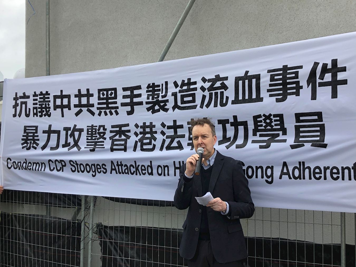 知名人权律师凯瑞·高尔(Kerry Gore)在集会中说:“这是一个令人难过的事件。这是中共在香港操控的,他们利用与警方有联系的人,或与黑社会有联系的警察而有组织的犯罪,设法阻止人们行使基本的人权和公民自由。”“由于这是对法轮功学员的直接攻击,这尤其令人担忧。我希望更多的法轮功学员参与十月一日的活动;我希望香港的法轮功学员不要因此而气馁;我希望香港人能够对香港的法轮功学员表示声援。”