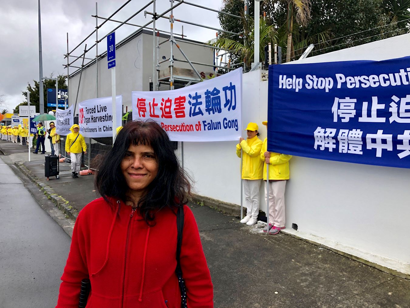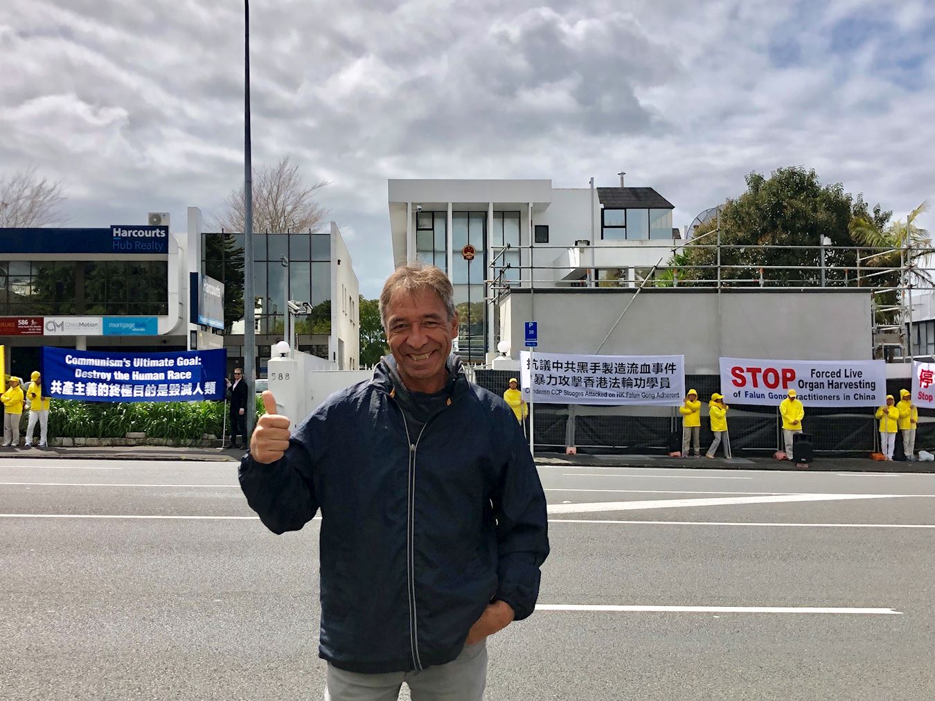奥克兰公民权利委员会主席巴里·威尔森(Barry Wilson)到场支持。他在发言中表示:“我今天到这里,来表达我对法轮功学员的强烈支持。我曾经在香港工作。我们可以推测,那些蒙面的袭击者是中共雇用的,这是最怯懦的行为。”他说:“这是对香港的法轮功学员以及和平抗议者的迫害。”