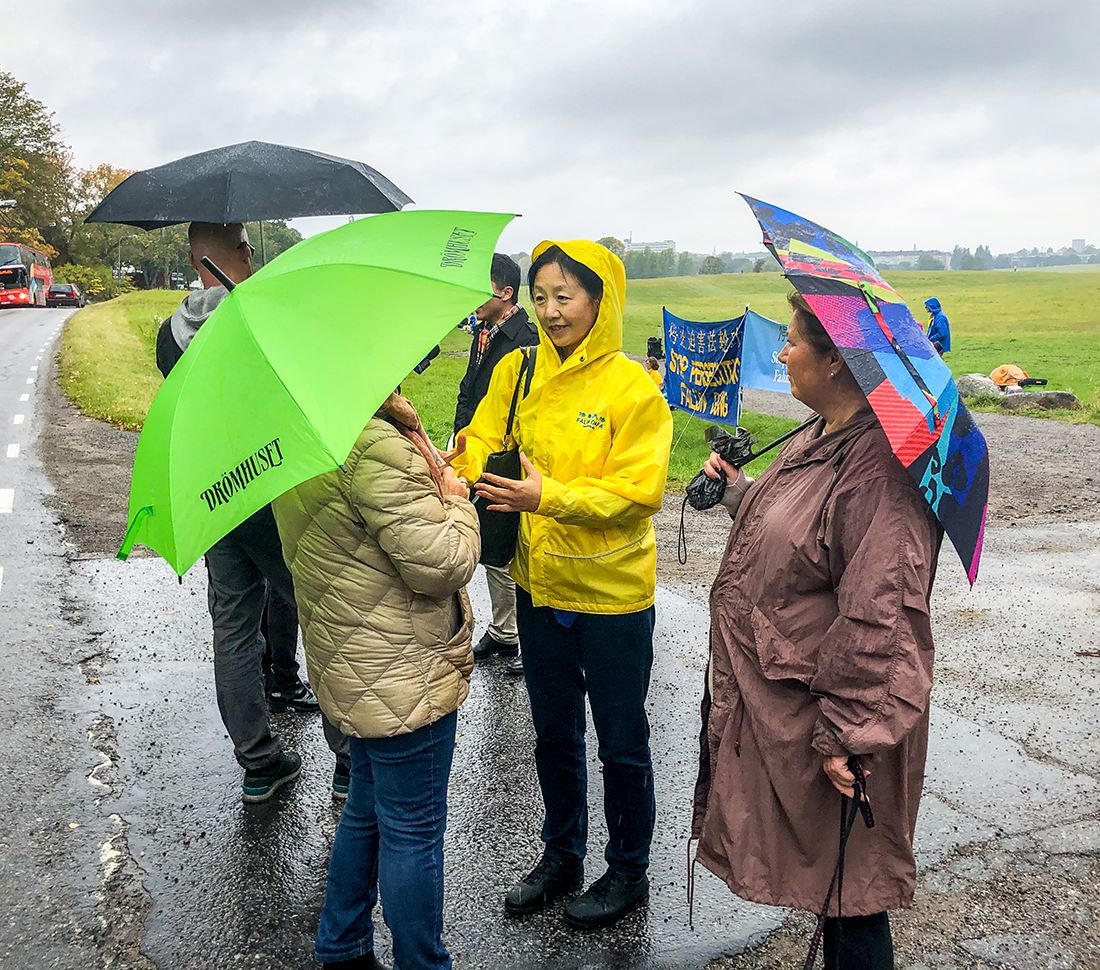 一位瑞典男士在雨中静静地听学员讲述中共迫害法轮功及活摘器官的事实真相后,他说:“我完全相信你讲的事都是真的,它(中共)在瑞典自由民主国家还这么卑鄙的表演,可想中共是多么邪恶,它是什么事情都能干得出来的。”