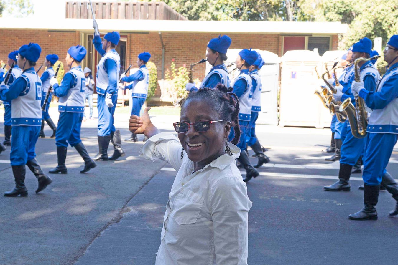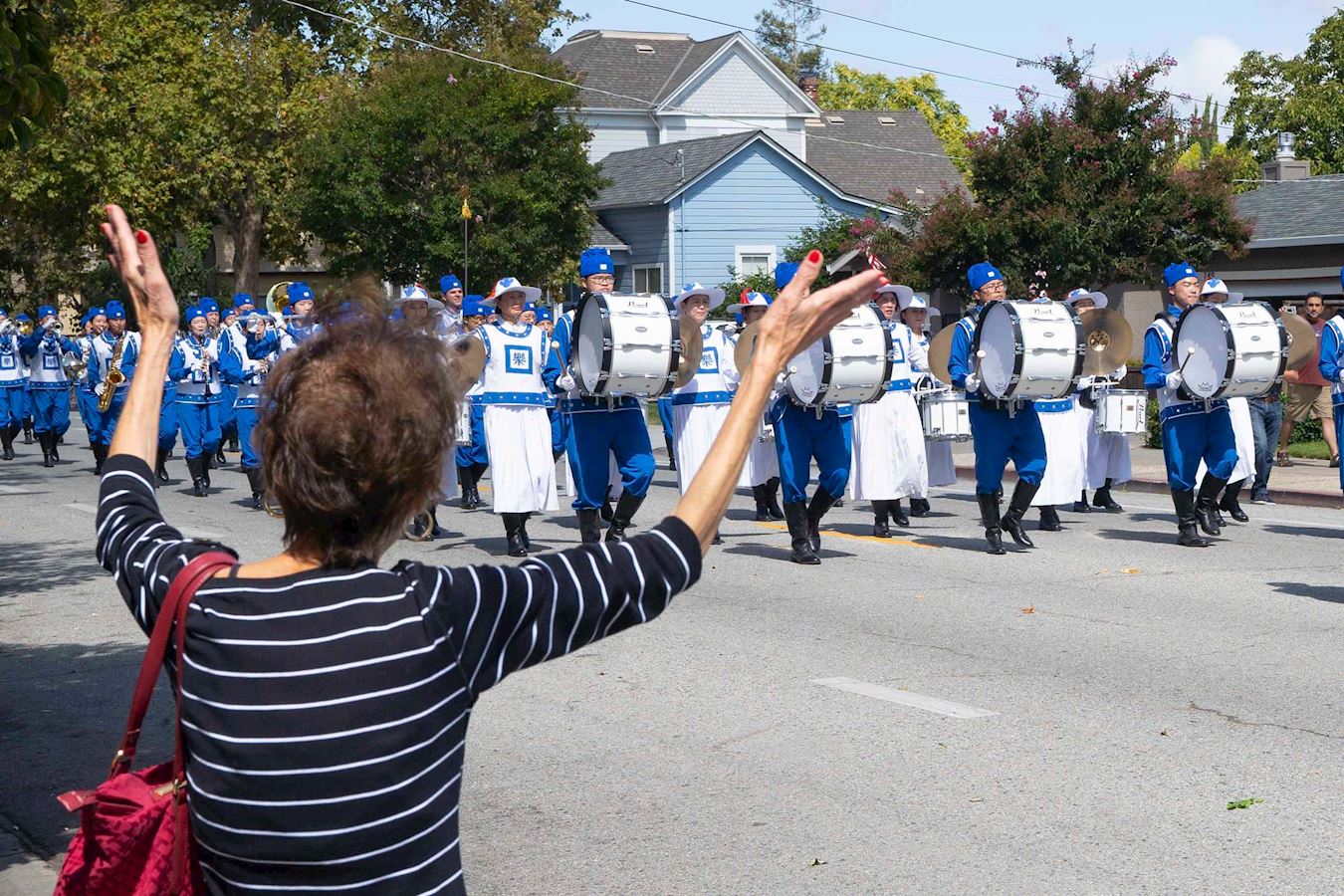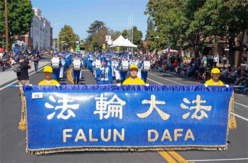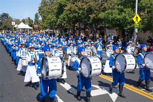 圣塔克拉拉居民希拉·海斯(Sheila Hice)看到天国乐团过来,就高兴地挥手。她说:“你们太优美了,我在旧金山的公园看到过法轮大法。法轮功的乐团非常棒,训练有素,我非常高兴看到你们来这里,与我们分享。我认为法轮功非常好,真善忍非常重要。”