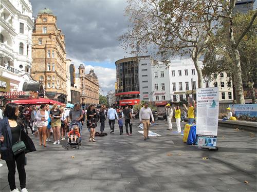 '图3~4:二零一九年九月一日,欧洲法轮功学员在莱斯特广场(Leicester Square)传播法轮功真相,吸引众多民众关注。'