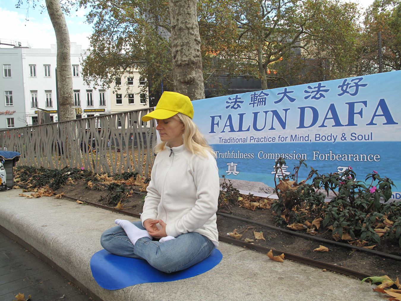 九月一日中午,来自瑞士法轮功学员丹尼丝(Denise)在伦敦莱斯特广场参加集体炼功。她表示,师父给欧洲法会的贺词让她警醒,她感受到师父洪大的慈悲,她知道自己必须抓紧时间去做法轮大法弟子该去做的事。“特别是听师父说:‘有没做好的,现在还没结束,那就做好你们该做的!’我看到希望,也感悟到师父慈悲的警示。”