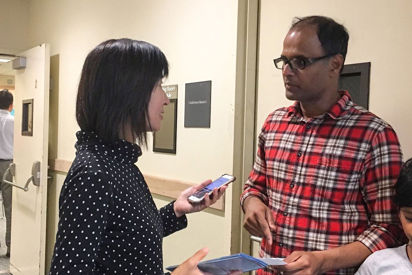 住在外地的玛妮莎(Manishe)到佛利蒙看女儿,偶然的机会走进学功班。她在学功时非常认真:“我告诉自己要放松,因为刚学,我还不会那样盘腿(双盘腿),但是我保持盘腿的姿势听法轮功老师讲课,我觉得应该这样。”玛妮莎还主动留下电话号码,希望有关于法轮功的信息,以后请一定通知她。