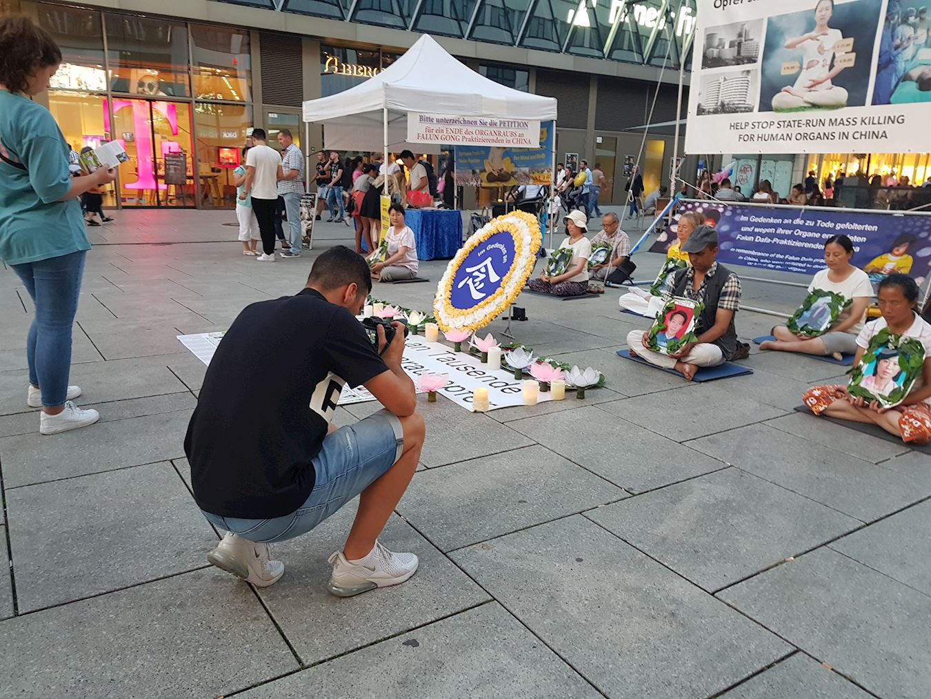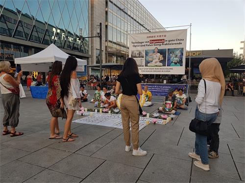 图1~2:2019年8月31日,法轮功学员在法兰克福商业大道上举办烛光守夜活动,引来路人的关注
