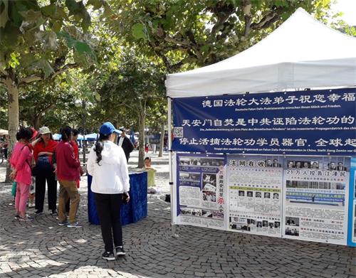 法轮功学员在“中国节”活动场所附近搭建了高大的横幅架和信息台,格外醒目。人们一走进该市著名的财尔(Zeil)商业大道,远远就能看到这个大型的信息台。