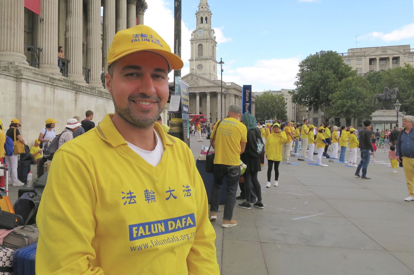 九月一日,记者在特拉法加广场遇到葛勘·图姆(Gökhan Tunc),他刚刚跟其他法轮功学员从中共驻英大使馆过来。他说这几天有很多体会,也感到能量很强。他认为:“使馆对面法轮功学员真相点是一个让人们了解真相的好地方。因为是直接面对中共政权的一个机构,能够告诉人们真相,让他们知道迫害的真相,尤其是在使馆的工作人员。”