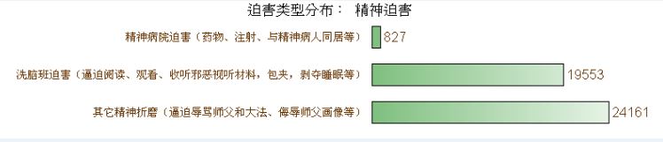 据明慧网统计,在4287名被迫害致死的法轮功学员中,有827人经受过精神病院迫害,包括药物迫害、注射不明药物、与精神病人关押在一起等等。山东的范秀芹、徐冰;广东的黄伟、上海的马新星、重庆的张英琼、陕西的魏欣蓉、江西的殷进美、黑龙江的鞠亚军、董连太、湖南的杨舜英、张志明、郭名高、李甲菊、童顶庆;四川的谭金会、袁永文、高光崇、吴义华、祝艺芳、邓建刚等法轮功学员都是被药物摧残迫害致死的。