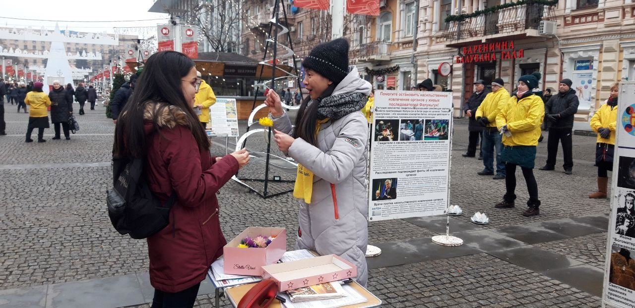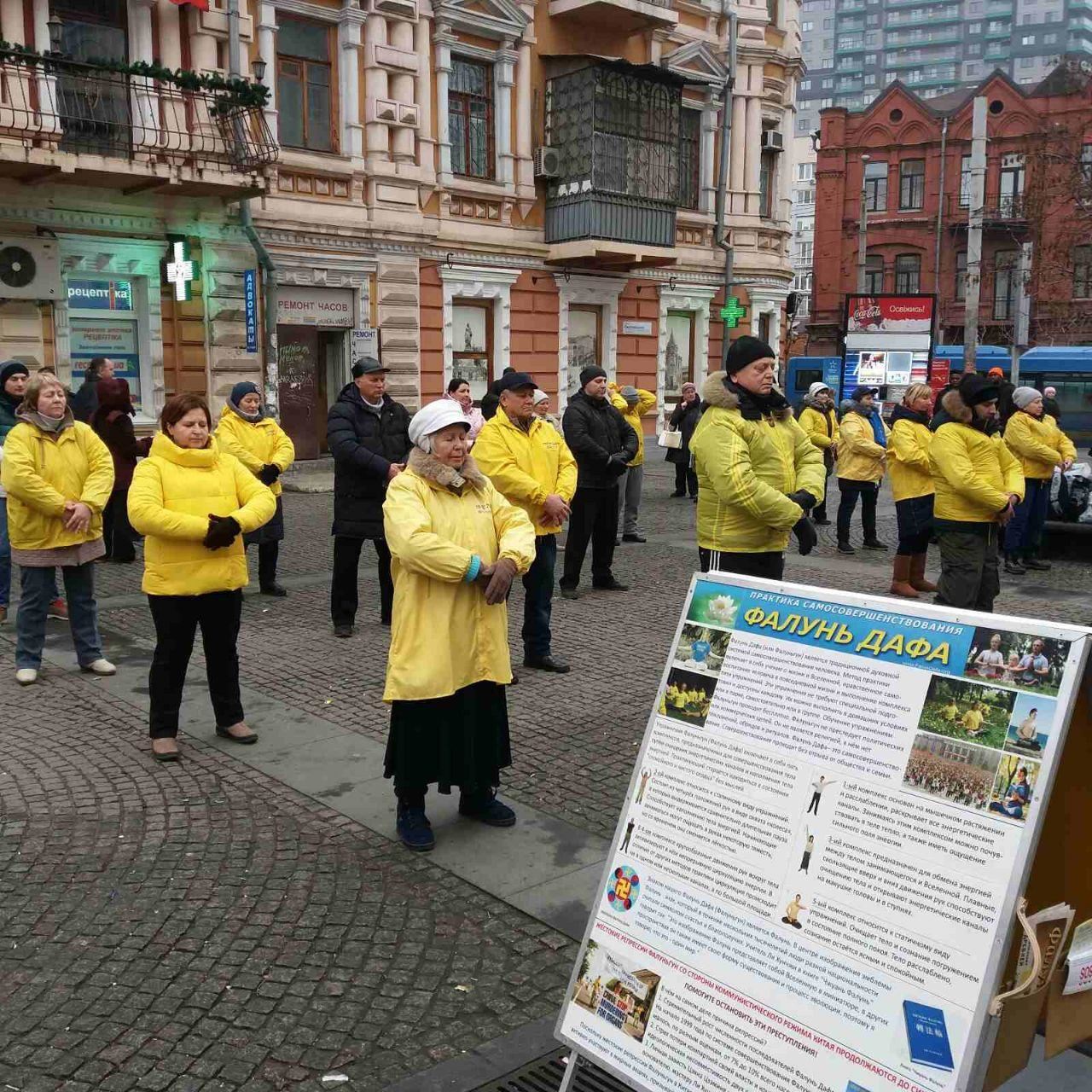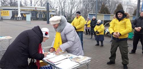 【明慧网二零二零年一月十五日】二零二零年一月十日至十二日,乌克兰第涅伯市法轮功学员举行冬季集体学法及弘法活动。来自乌克兰主要城市的法轮功学员相聚在此,向这座具有上百万人口的城市传递大法信仰的福音。在为期三日的活动中,学员们展示功法,派发真相资料,征集反对中共迫害法轮功以及诉江的签名。尽管天气异常寒冷,人们仍驻足了解真相,支持学员反迫害活动。