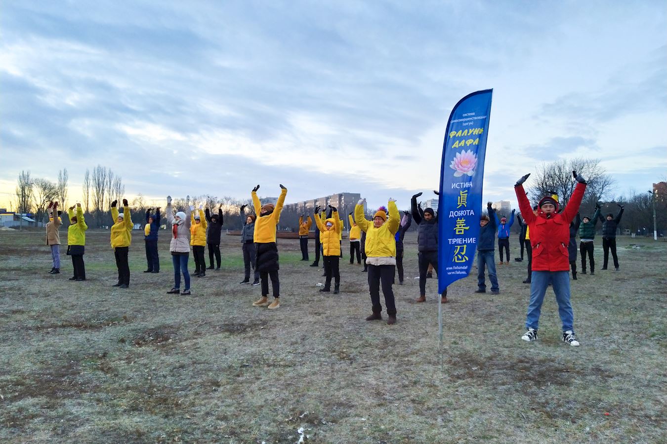 ![]() 图1:在卡马河畔切尔尼市(Naberezhnye Chelny),法轮功学员集体炼功 |