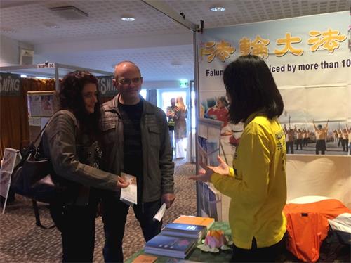 参展商约瑟芬妮(Joephine)的展位在法轮功展位对面,当她那边没有客人时,她都把目光转向法轮功这边来,微笑着静静地看学员展示功法。下午快结束时,学员到她的展位,送给她写有“法轮大法好”的小莲花和法轮功简介。她很高兴地表示想学功,写下她的联系方式。过了一会儿,她又来到法轮功展位看还有什么资料,想了解更多。她看到一份有关法轮功对健康有益的报告时说:“好象我没有得到这个资料?我可以拿吗?”自然她如愿以偿。