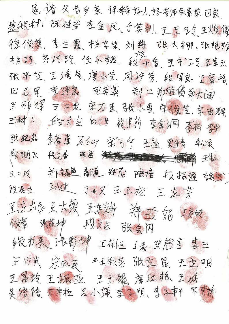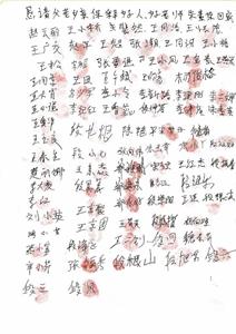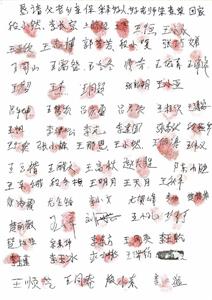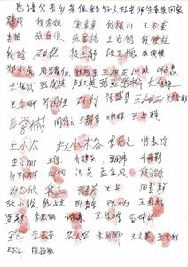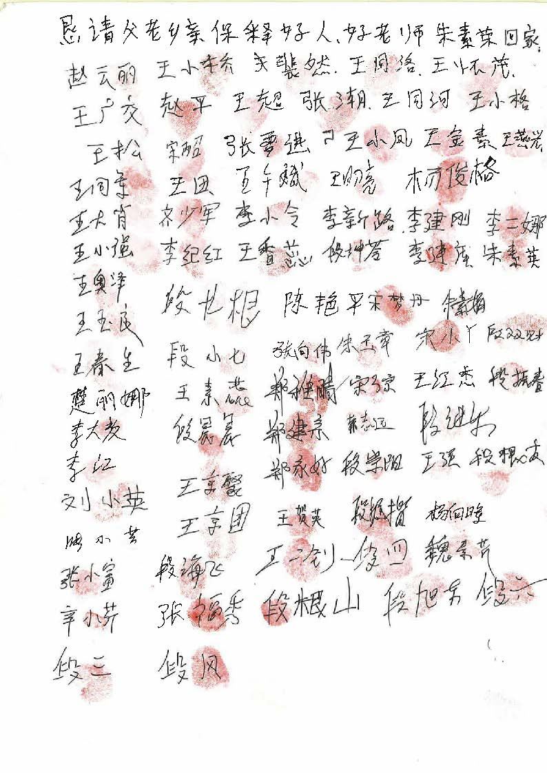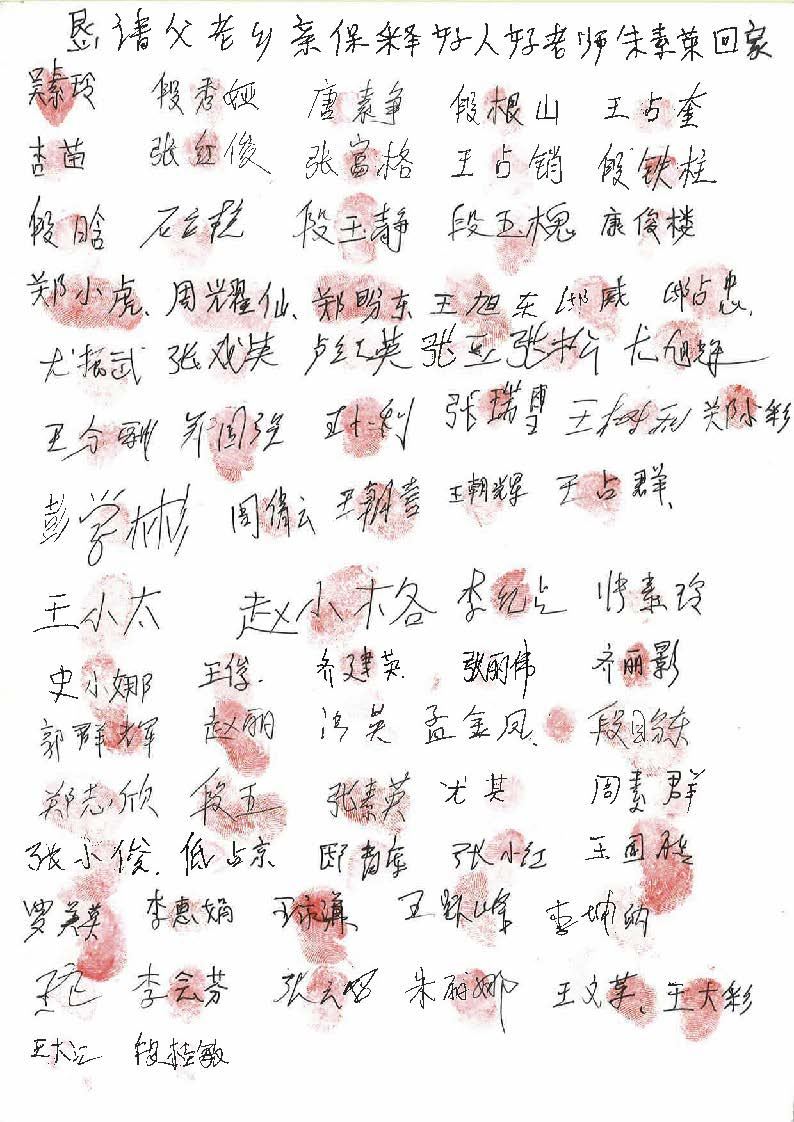 当乡亲们知道自己的红手印能帮助朱素荣老师早日回家,便纷纷签名、盖手印,只几天功夫就征集到了300多人的签名(有许多人出外打工没在家)。