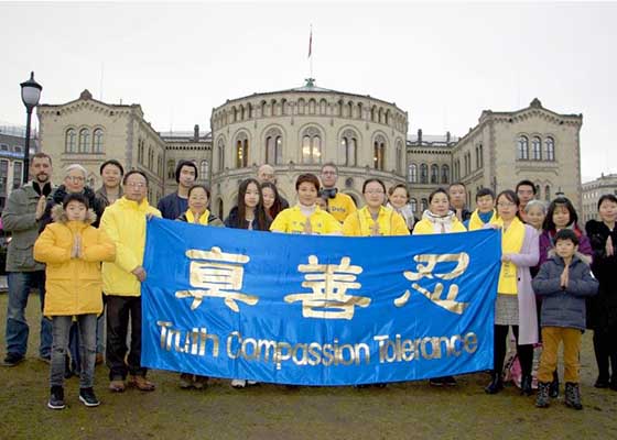 在中国传统新年即将到来之际,挪威法轮功学员聚集在国会大厦前,向慈悲伟大的师尊拜年,恭祝师尊过年好,感谢师尊救度之恩。