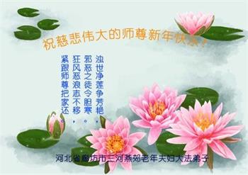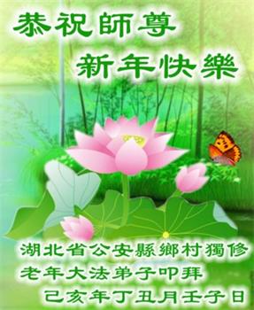 我们老俩口是八、九十岁的老人了,我们因为天天念法轮大法好,身体比以前好的太多了,老伴两次生命出现危险时,都是念大法好、求大法师父救度,才得以转危为安。我们太感谢大法师父了,我们相信您就是来救人的,我们太感谢您了,祝大法师父过年好!