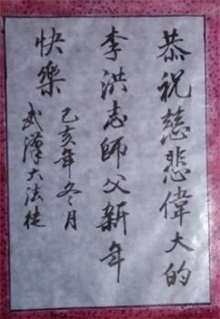 最近我又拜读了大法宝书《转法轮》。感觉书中讲的很有道理。我谢谢李大师给了我新生!我代表我的全家人恭祝李大师过年好!李大师,您的大恩大德我永世不忘!