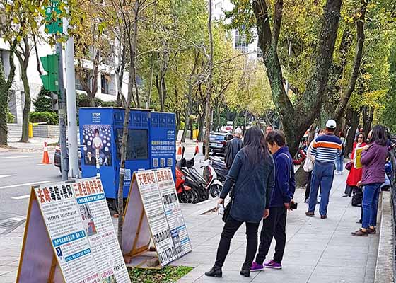 庚子年大年初一,轮功学员仍坚持在台北国父纪念馆园区。守候来自世界各地的有缘人,传播法轮功真相及弘法。