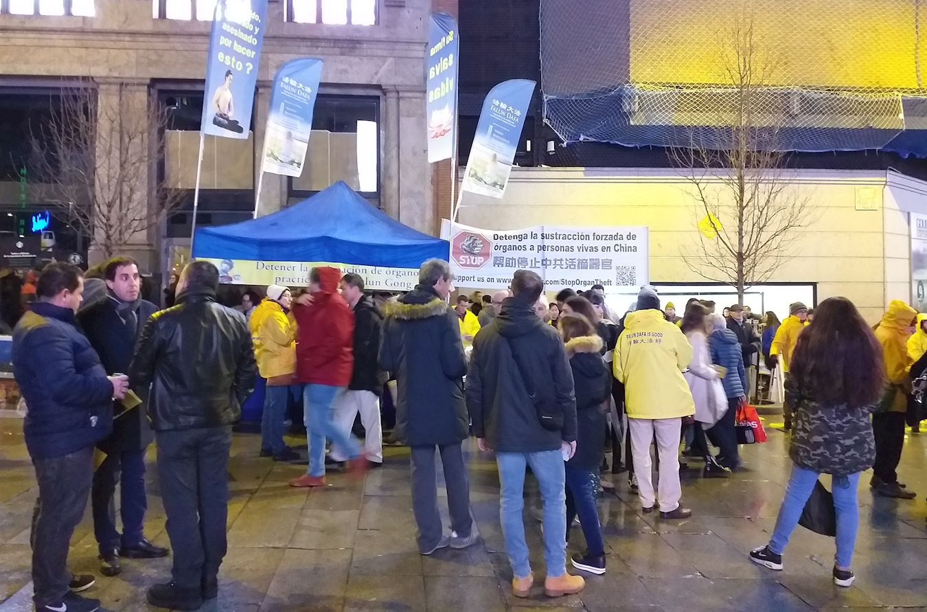 二十五日下午,法轮功学员在马德里市中心卡亚俄广场(plaza del Callao)举办了介绍功法和征签的活动,佳节传真相是给人们最好的新年礼物。尽管天气寒冷,悠扬的炼功音乐和舒缓的功法演示让行人放缓了脚步,他们纷纷驻足观看拍照。热心的西班牙人踊跃签名,谴责中共对法轮功的迫害,征签的摊位上从活动开始到结束一直挤满了人。