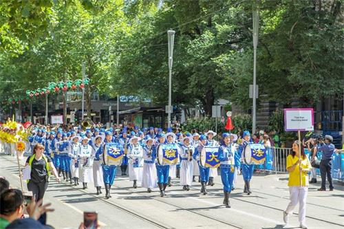 法轮大法团体的游行队伍由身穿蓝白相间中国古代服饰的天国乐团引领,威武雄壮的乐声振奋人心,游行队伍中精心制作的花车、祥和的五套功法展示以及优雅明艳的扇子舞,在灿烂的阳光下,光彩夺目,成为游行的亮点。