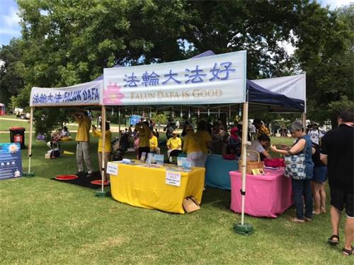 ![]() 图6~8:澳洲国庆日当天市中心举办大型游园会,介绍法轮大法的展位上学员们不间断的展示五套功法,现场有不少民众学炼。 |