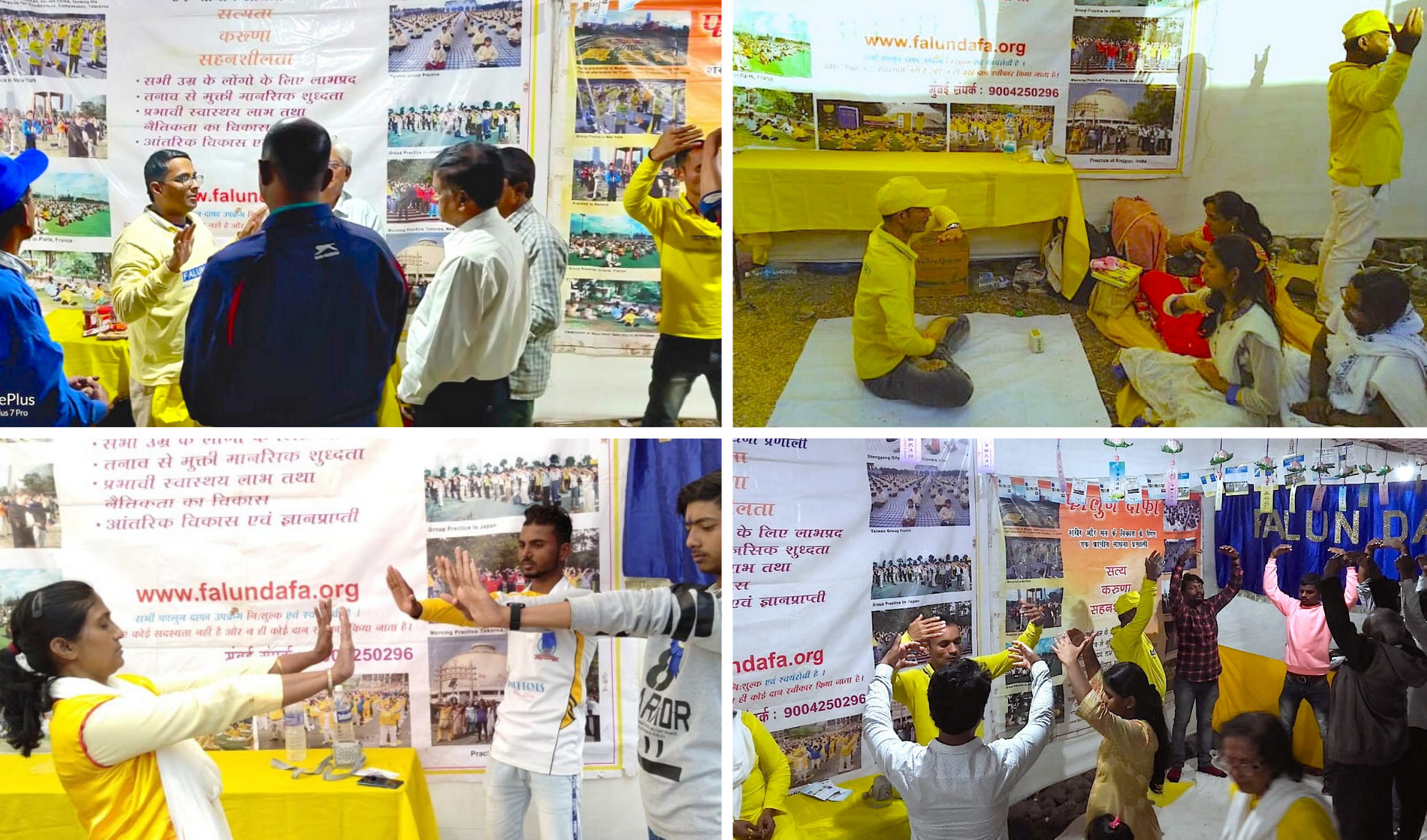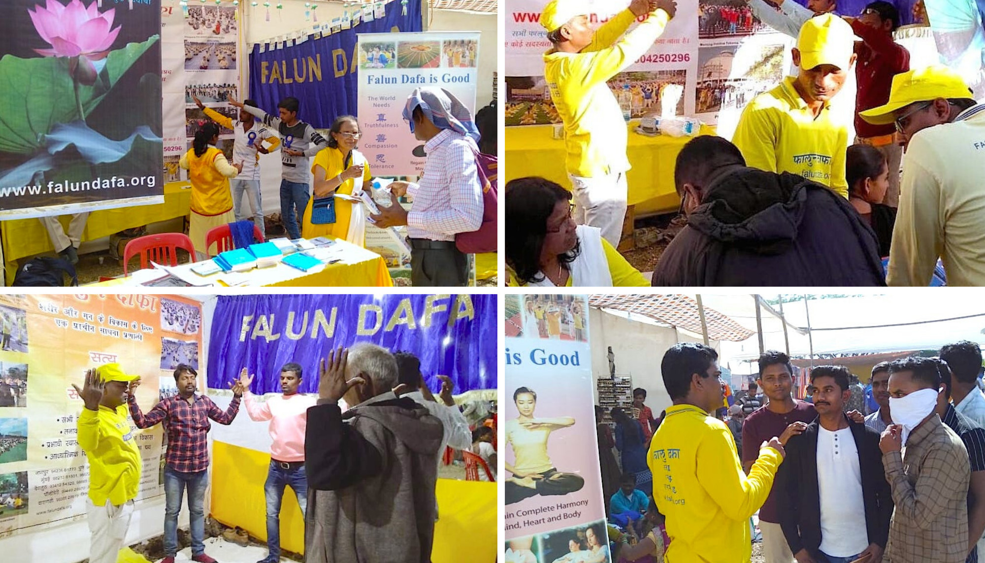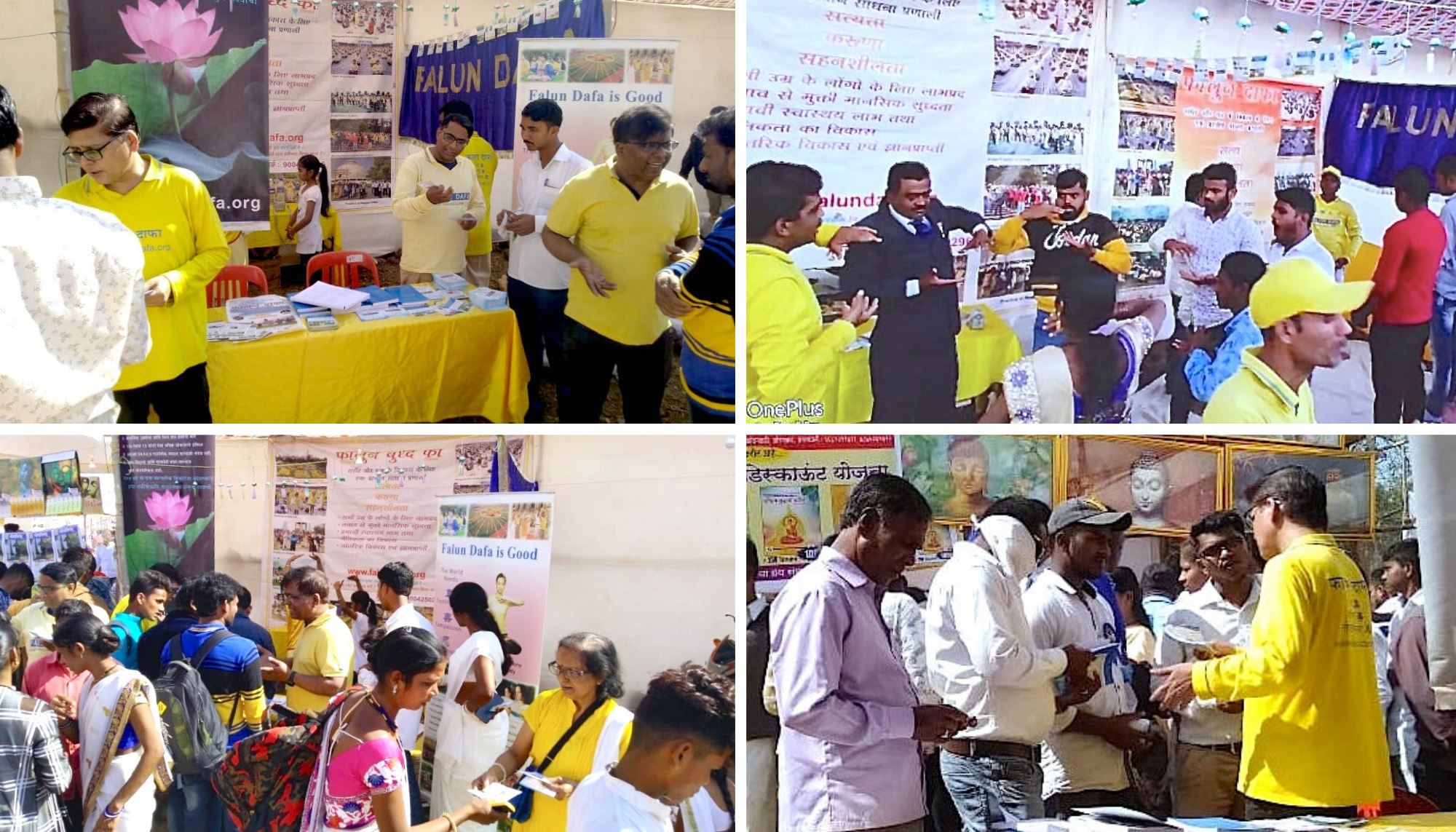 来自浦那(Pune),那格浦(Nagpur)和孟买(Mumbai)的学员们在法轮功展位上布置好了信息台,在潮水般涌进的人群中,学员们在信息台附近派发着法轮功真相传单,有的学员在为详细咨询的人们讲解什么是法轮功,以及在中国大陆发生的持续二十年来对法轮功学员迫害的真相,了解了真相的人们非常吃惊,觉得不可思议,无法想象。