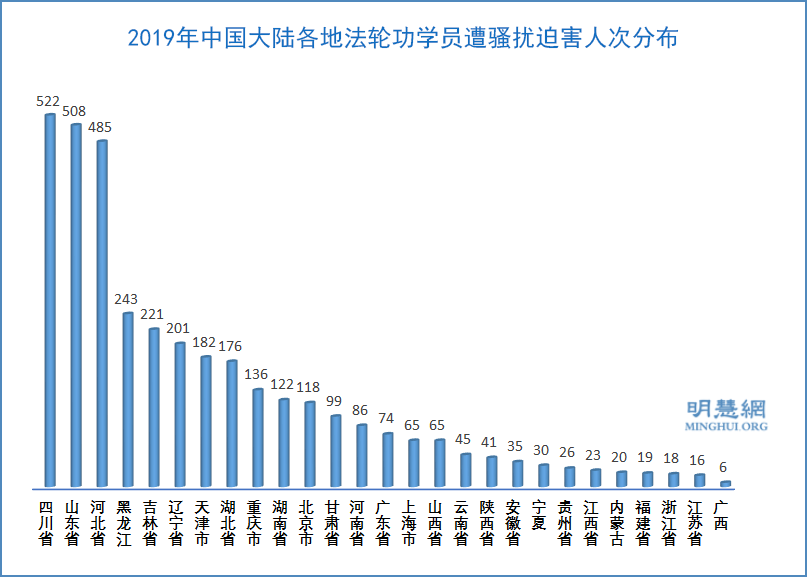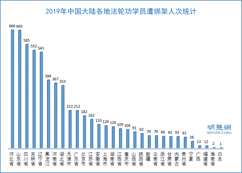 ![]() 图1:2019年中国大陆法轮功学员遭中共迫害人次统计 |