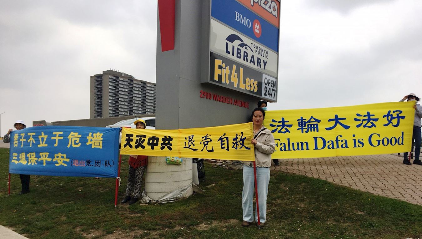 二零二零年十月十日和十一日,大多伦多地区的三十多个繁忙的大路口,作为退党义工的法轮功学员们打出横幅:“End of CCP”(终结中共)“The Ultimate Goal of Communism:Destroy Mankind”(共产主义的终极目的:毁灭人类!)“China’s Communist Party to Blame For Pandemic”。(中共必须为瘟疫大流行而遭到谴责!),“Protect Canada from Pandemic. Reject China's Communist Party”(保护加拿大免遭病毒,拒绝中共),吸引了很多民众驻足签名,现场三退(退出中共党团队)、拿相机拍照和表示支持。也有不少匆忙走过路口的人说:“支持你们!”“我同意!”“坚持啊!”“不要放弃!”