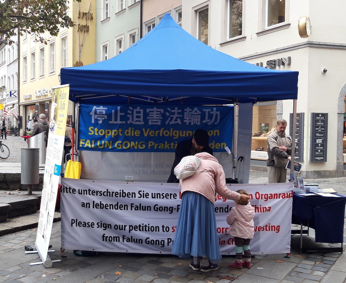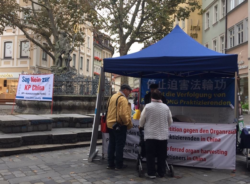 一对来班贝格探亲的德国夫妇经过摊位时,主动跟法轮功学员聊起来。他们对中国发生的事情很感兴趣,包括香港的事情,很乐意了解更多法轮功的真相,拿走了详细介绍的特刊。
