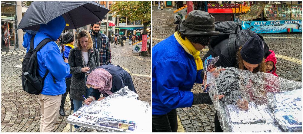 图4:人们在仔细阅读法轮功真相展板,明白了真相后的瑞典民众签名支持法轮功学员反迫害